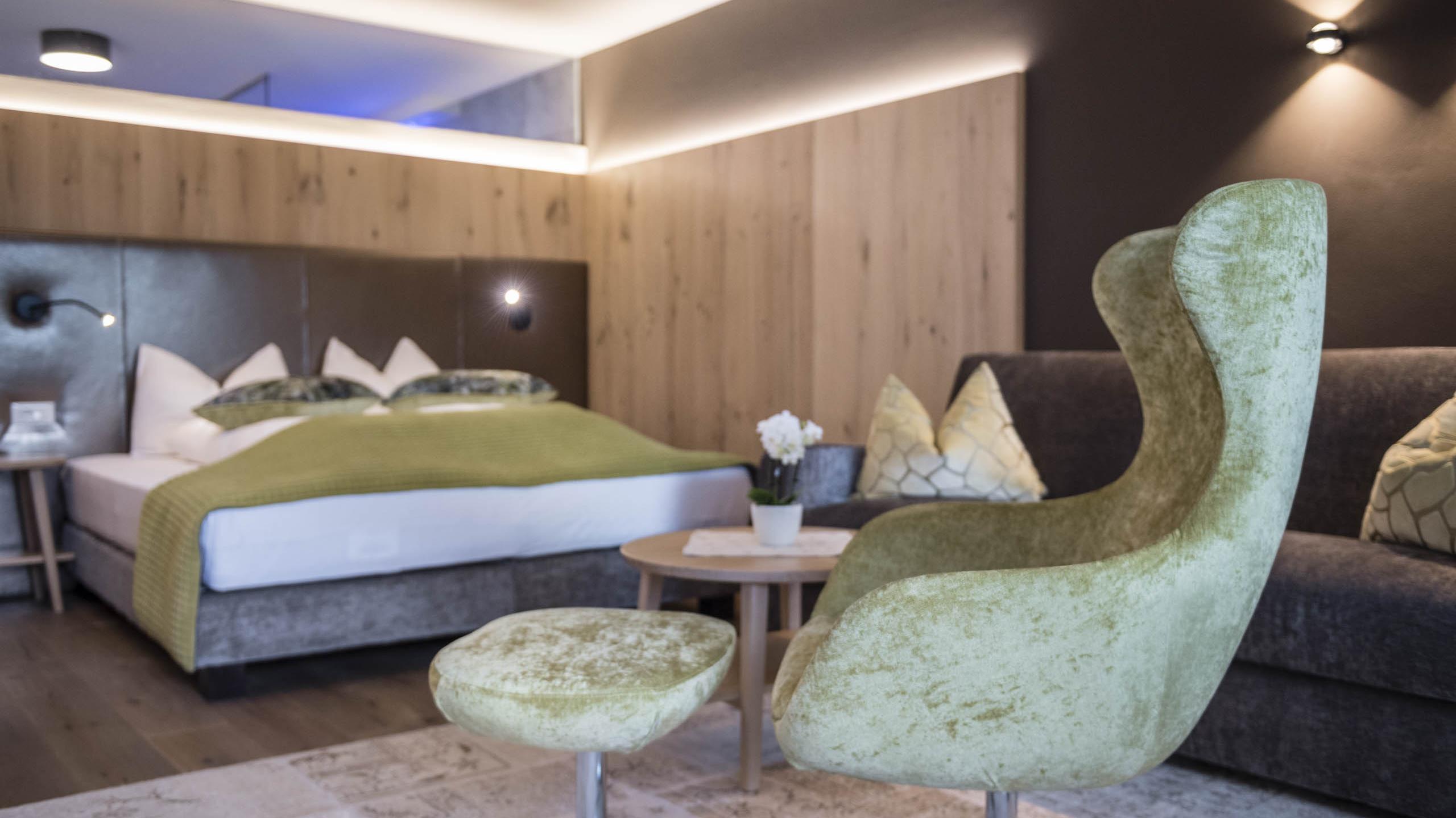 Family suite, ca. 55 m², 2 to 6 person, with 2 separate bedrooms (with connecting door) and living room corner, walk-in cupboard, large terrace with garden furniture, bathroom with bathtub, shower, double washbasin, WC and bidet separate, 2 TVs (satellite), minibar, direct telephone, safe, hairdryer, minibar, bathrobe, bathbag, slippers, garage inclusive, WIFI for free in the whole building. The pictures are examples of the rooms, these may vary in color and disposition depending on the location in the house.