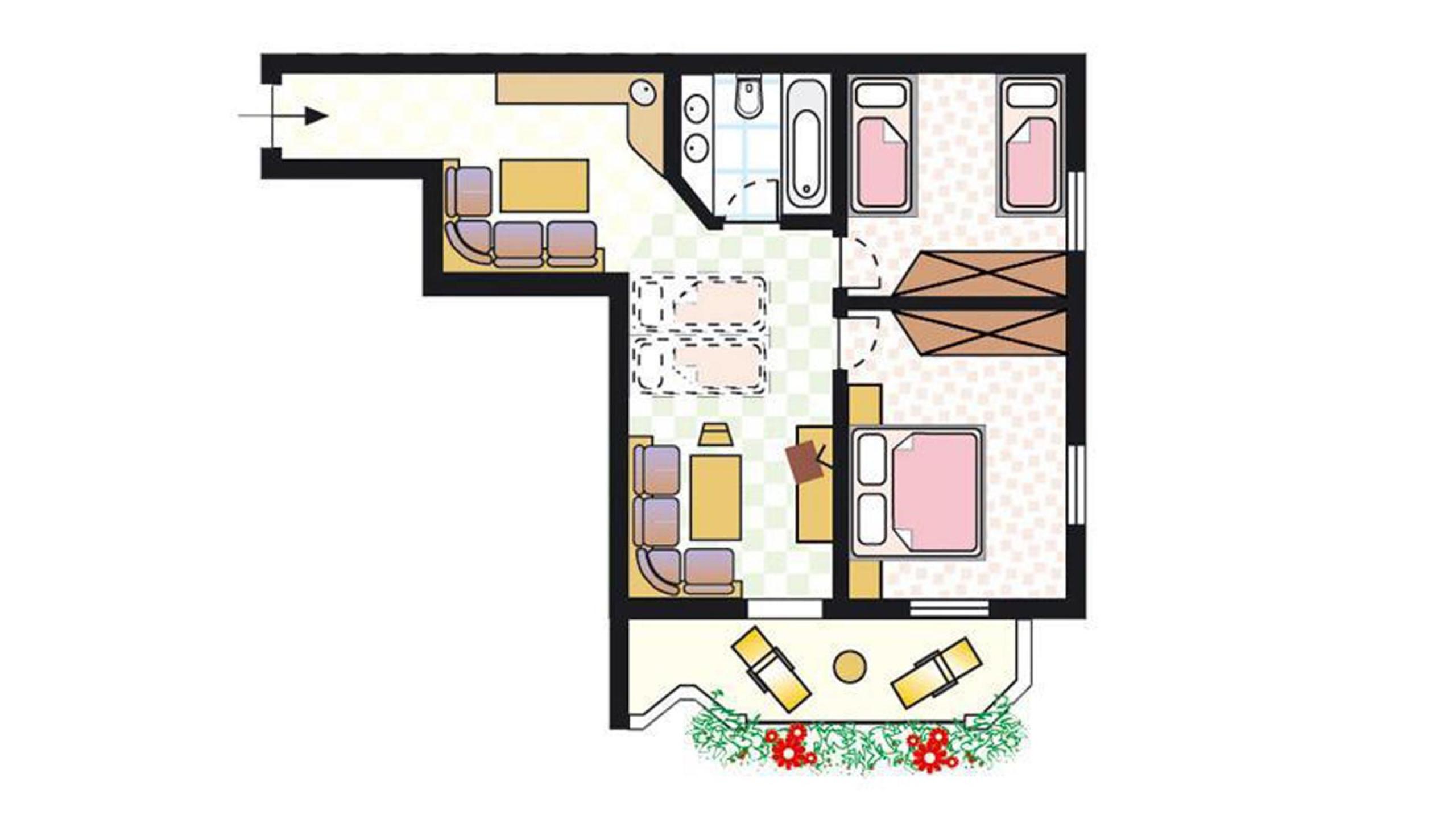 Apartment, ca. 66 m², with balcony, living room, for two to six occupants, kitchen, bathroom, T.V. (satellite), safe, direct-dial telephone, including parking space in garage. Direct Internet connection in your room.