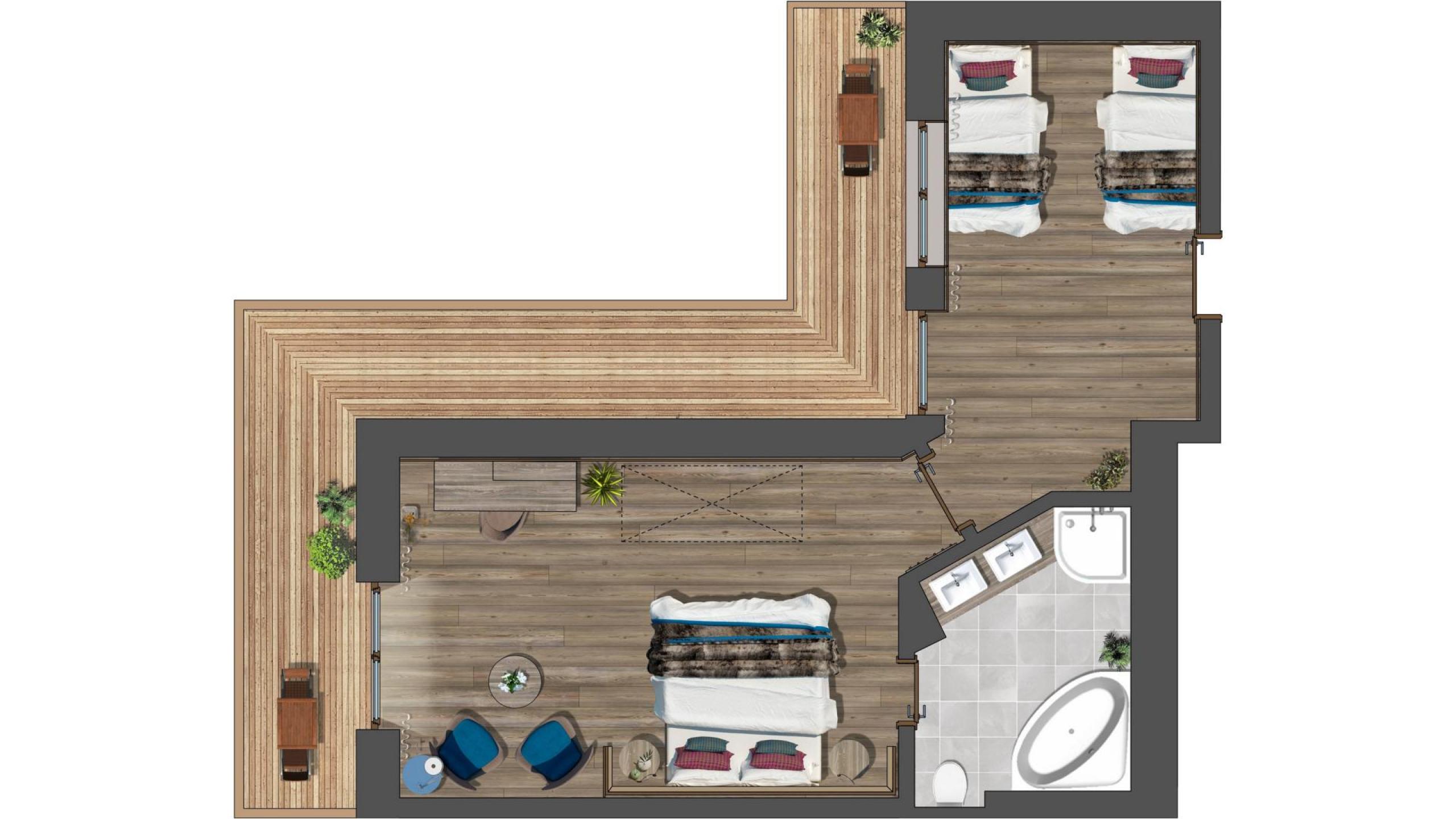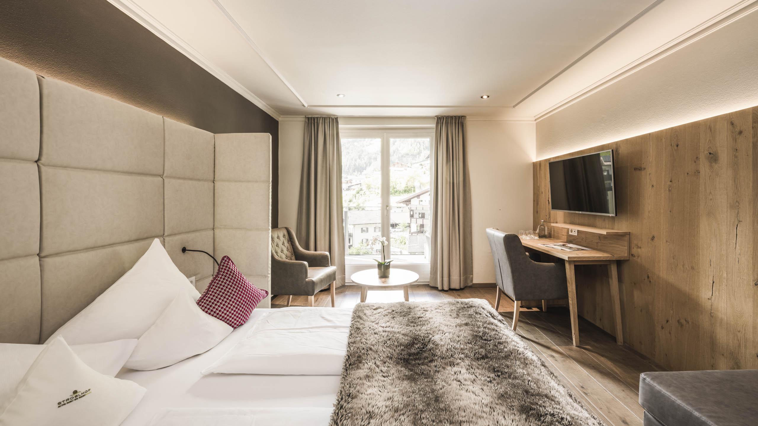 Familienzimmer für 2 bis 4 Personen, ca. 55 m², mit Holzboden und modern alpiner Einrichtung, zwei getrennte Schlafzimmer, WC, Badewanne und Dusche, Doppelwaschbecken, Balkon, TV (Sat), Minibar, Safe, Haarföhn, Direktwahltelefon, Bademantel, Badetasche, Badeschuhe, inklusive Garagenplatz, W-Lan kostenlos im ganzen Hotel.Die Bilder anbei sind Beispiele der Zimmer, diese können in Farbe und Einteilung je nach Lage im Haus variieren. Alle im Stammhaus mit Blick Richtung Dorf gelegen.