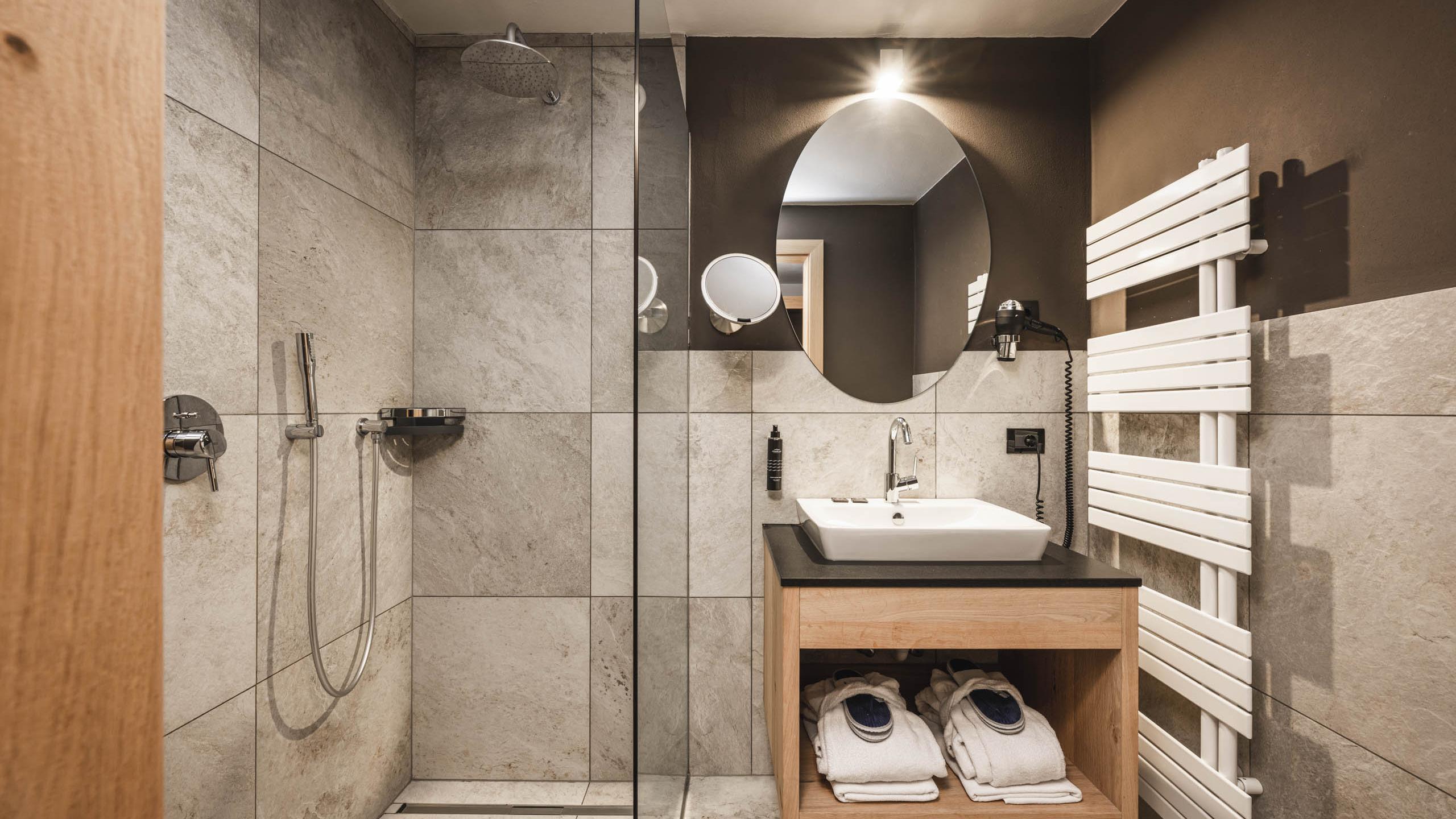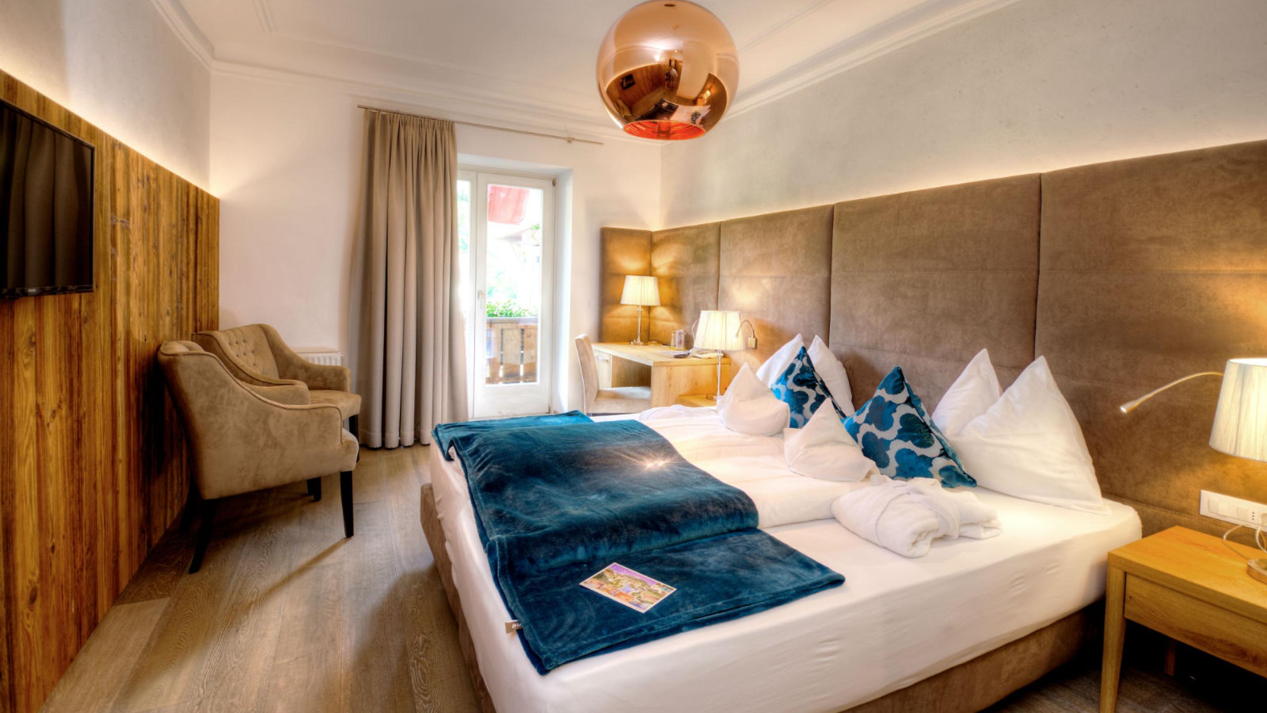 Doppelzimmer, ca. 23 - 26 m², mit Holzboden, in modern alpinem Stil mit Altholz eingerichtet, WC, Badewanne oder Dusche, TV (Sat), Safe, Haarfön, Minibar, Direktwahltelefon, Balkon, Bademantel, Badetasche, Badeschuhe, inklusive Garagenplatz, WIFI kostenlos im ganzen Hotel. Die Bilder anbei sind Beispiele der Zimmer, diese können in Farbe und Einteilung je nach Lage im Haus variieren.